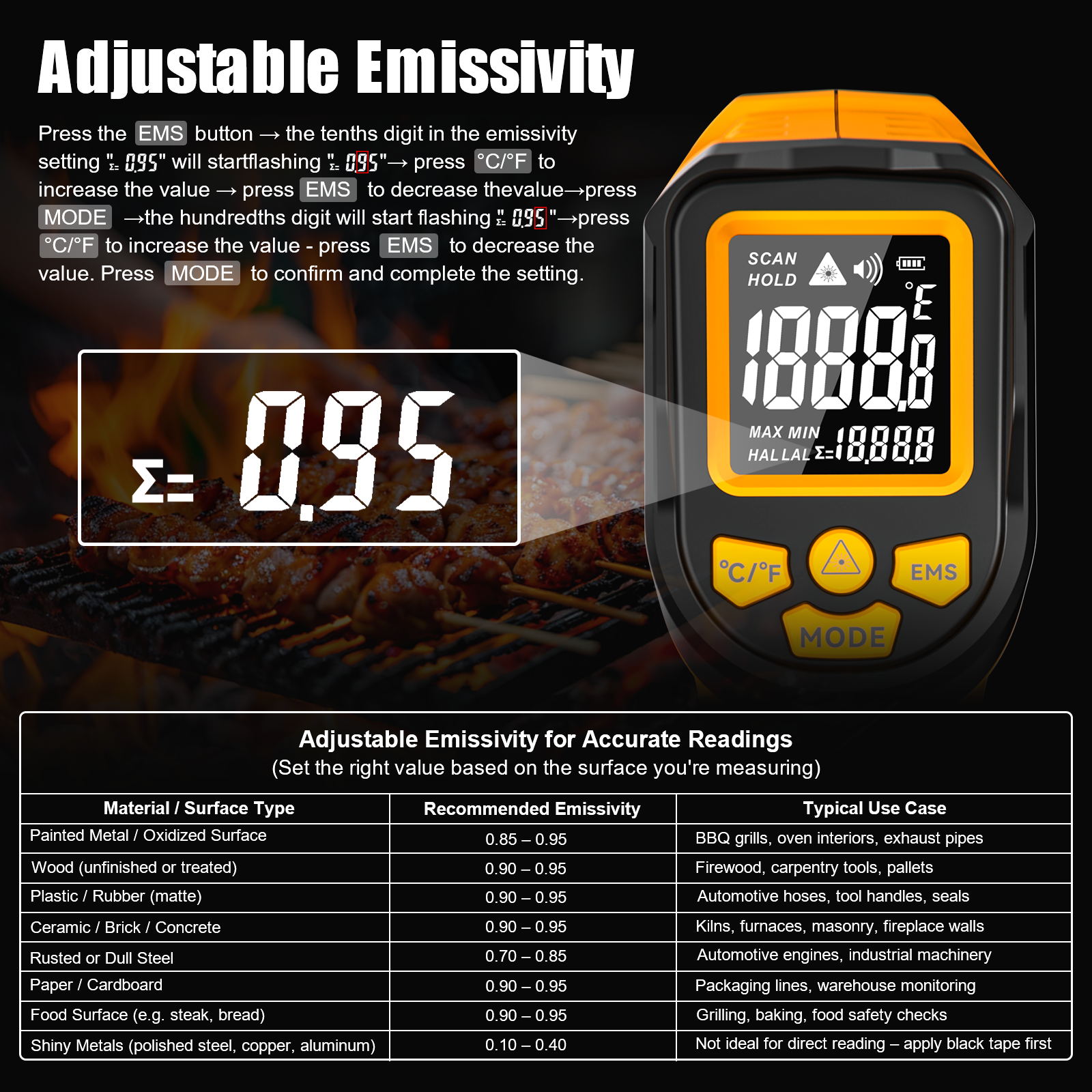 Precise Measurement: With adjustable emissivity and a 12:1 distance ratio, it can accurately measure temperatures from various surfaces and distances, meeting diverse measurement needs.