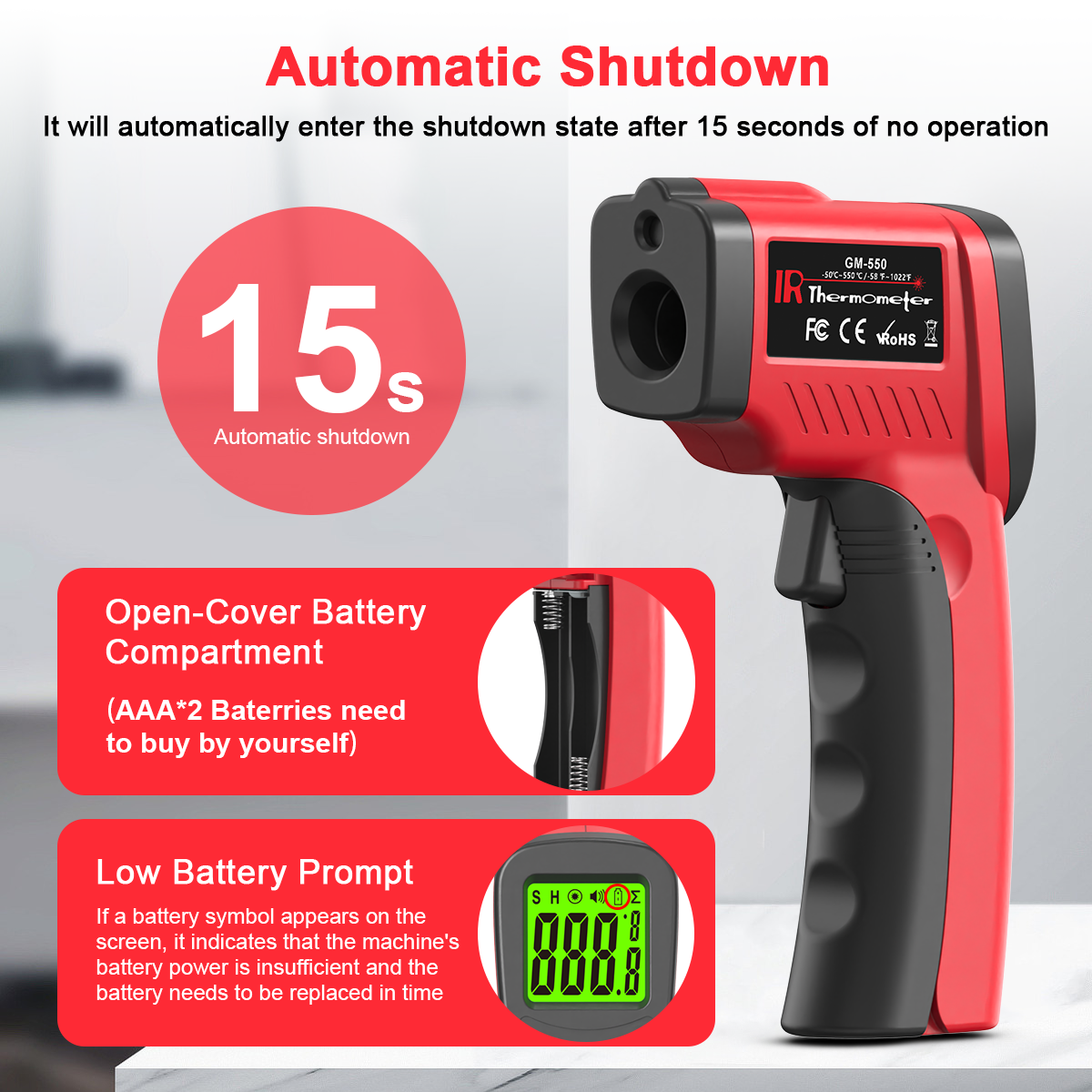 • Measurement Tips:When measuring boiling liquids, keep 45° – 60° angle, avoid smoke/steam on sensor. Temp is where laser spot is, not projection area.
