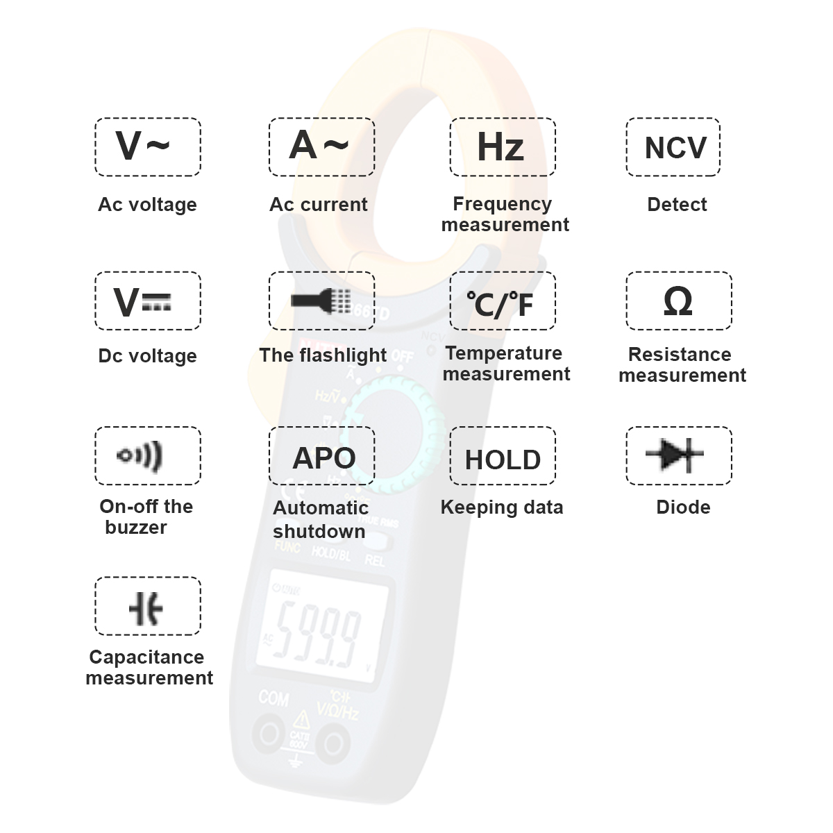 Equipped with T-RMS technology, this 6000 counts clamp meter accurately measures AC current, AC/DC voltage, temperature (with thermocouple), NCV, capacitance, frequency, resistance. It also supports diode testing and continuity beeping—ideal for home solar system maintenance, automotive electrical troubleshooting, and industrial use. Perfect for electricians, professionals, and DIY enthusiasts.​