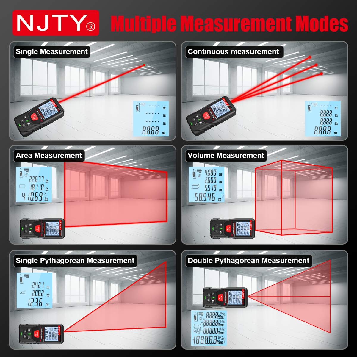 *The pictures shown are OEM models. If you need customization, please contact us. For direct purchases, we’ll uniformly ship devices under the NJTY brand.Laser distance meterHigh accuracy ±1.5mmPhase-shift distance measurementDecoration measurementLithium batteryABS+TPR (ABS+TPR